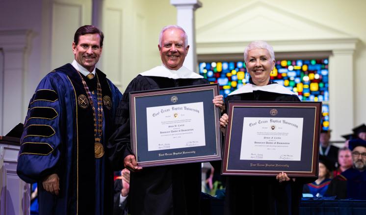 Dr. Blackburn presented Steve and Penny Carlile with Honorary Doctorates during the second ceremony. Steve and Penny Carlile have been connected to East Texas Baptist University for many years, as both Steve and Penny previously served as members of the ETBU Board of Trustees. After graduating from Marshall High School and Baylor University, Steve and Penny returned to their hometown of Marshall to build a life and leave a legacy for their family, church and community. Steve joined his family's oil and gas business in Marshall, and in 1996, they founded Home & Garden Party. This direct sales company was designed to empower women in the workplace and to employ people in Marshall and the surrounding area. They have also been involved in real estate and banking businesses. Penny is the author of a novel, "The Girl on Rusk Street." The Carliles have invested in their hometown by supporting local organizations and initiatives, including Mission Marshall, the Boys and Girls Club of the Big Pines, Marshall Independent School District, Marshall downtown revitalization, and Marshall City Park. In 2003, the Carliles were named Citizens of the Year by the Marshall Chamber of Commerce. In 2018, ETBU awarded Steve and Penny the Sam B. Hall Civic Service Award. Steve and Penny Carlile Hall is named in honor of Steve and Penny for their generous investment through institutional service, campus building initiatives, and encouragement to expand and increase the impact of East Texas Baptist University.