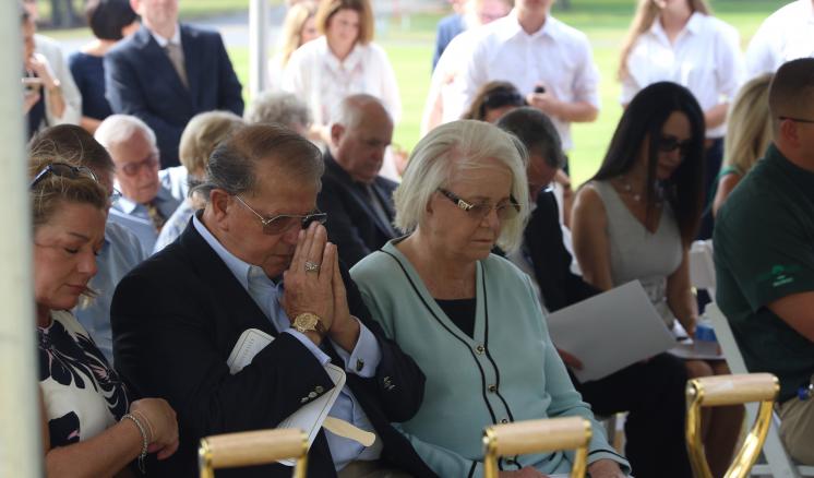 East Texas Baptist University faculty, staff, and trustees met together on Friday, August 30 at the future site of the Chapel on the Hill and Kenny Ponder Park, as President J. Blair Blackburn and the Ponder family officially broke ground for the new construction. Located adjacent to the pond on ETBU’s campus, this facility will be a dedicated house of worship to focus on the power of prayer, the sanctity of biblical marriage, and the celebration of loved ones.